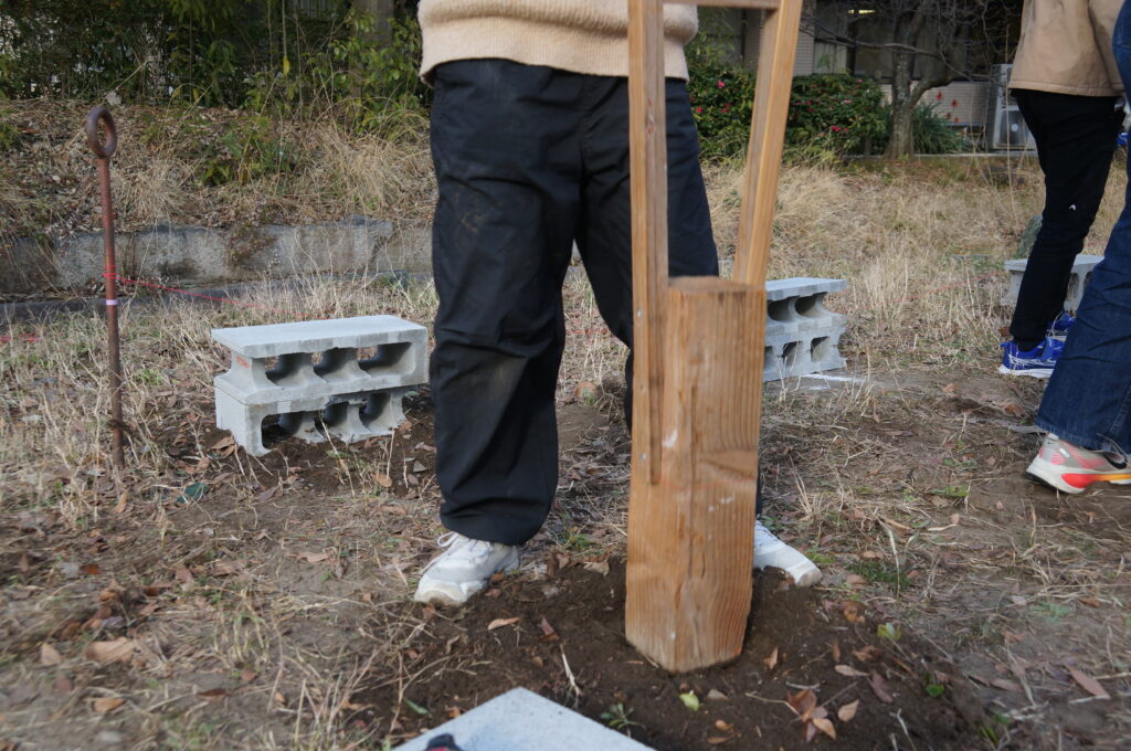 6Bの子どもたちが,ゲストティーチャーに教わりながら,小屋作りに挑戦しています。今回は,基礎を作っていたんですね~。土をしっかり固めて,水平を出してブロックを設置しました。この先,どんなのができるのか楽しみです。