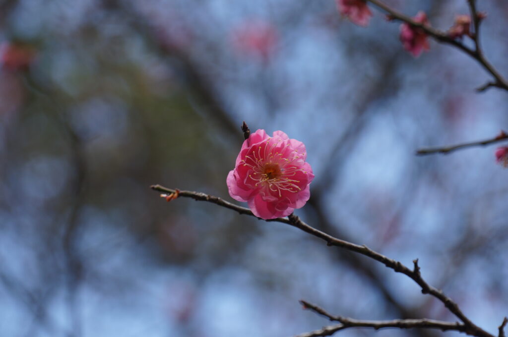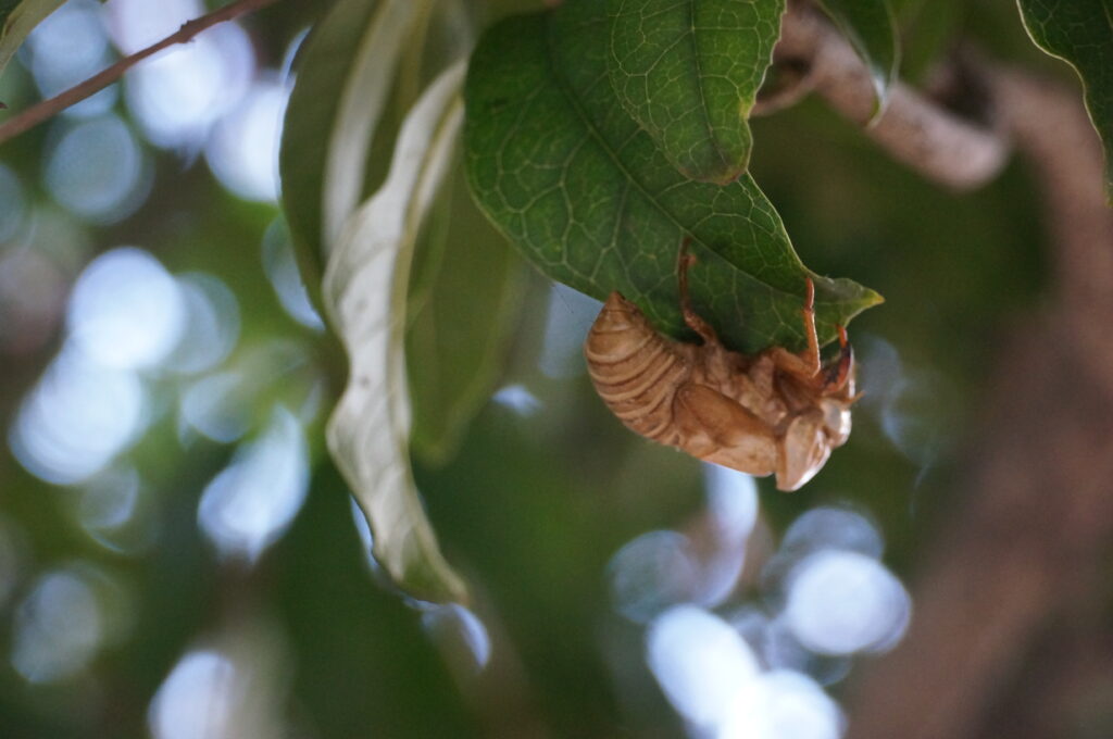 野外ステージで活動する子どもたちを,まだ残っているセミの抜け殻や,きれいな梅の花が見守ります。