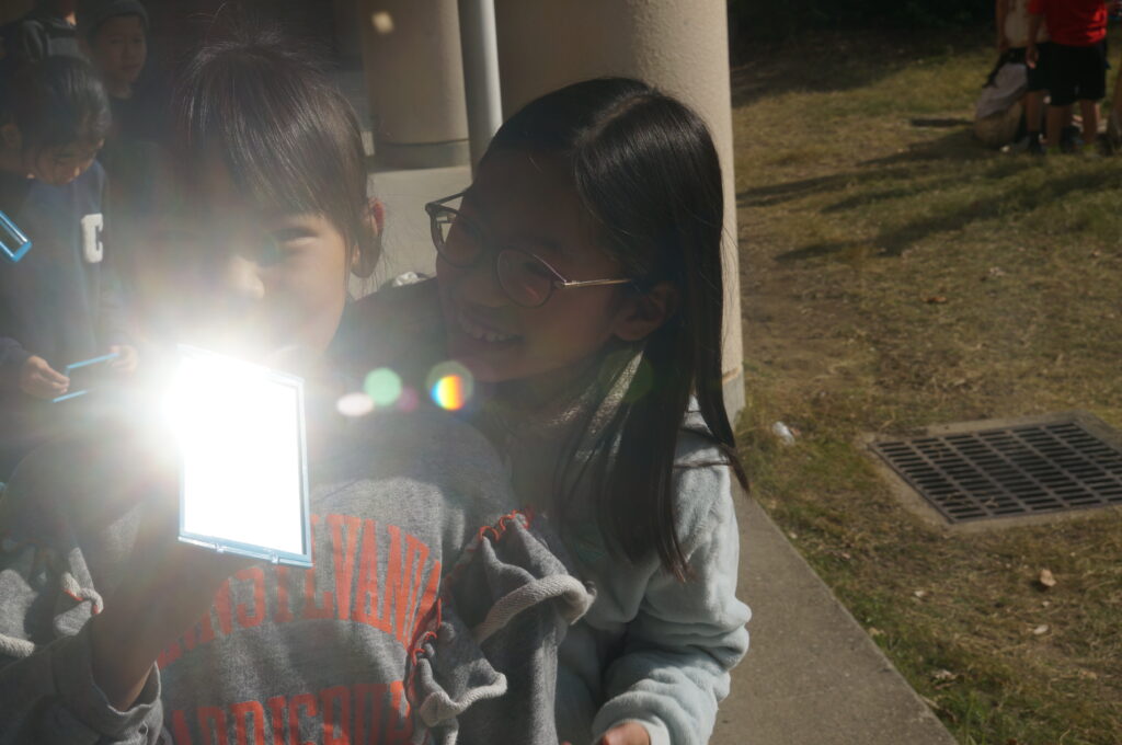 ずっと向こうの中学校の壁まで一瞬で光が届くなんて!もちろん手で触れているわけではないんだけど,なんかそこに到達できたような気持ちになる。