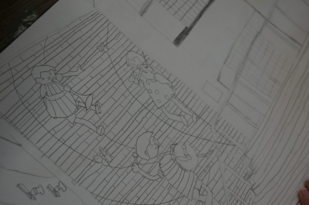 図工の授業にもお邪魔(o^ー’)b これは,児童玄関の吹き抜けにあるモチーフ。細かく描けてるし,曲線の階段もいい感じ。