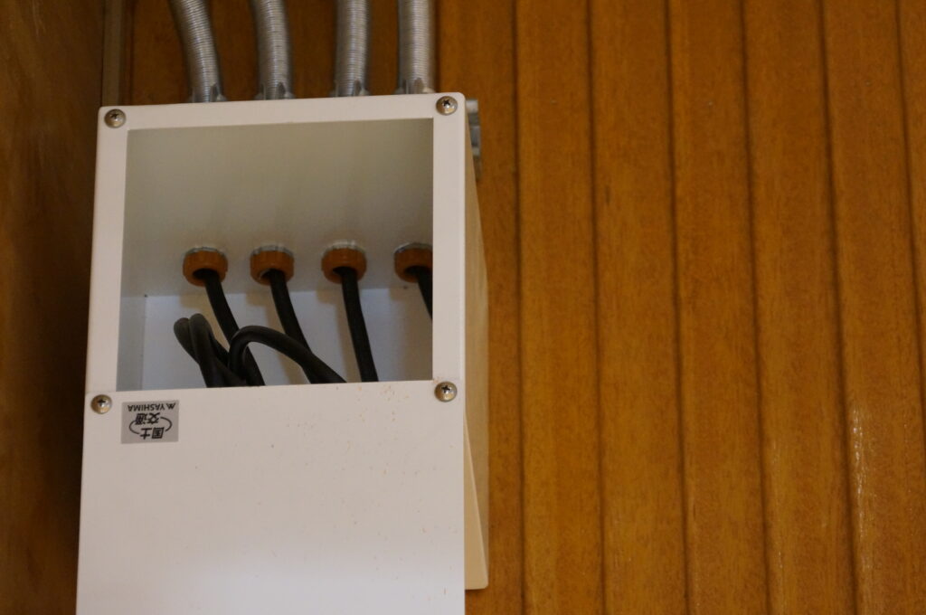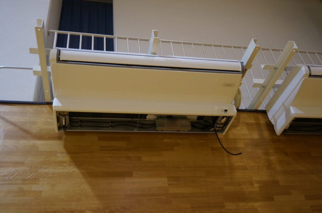 体育館の左右,上を見てみるとエアコンの室内機がドドドドっと並んでいます。これは,まだ工事中。このあと,機械ももうちょっと付いて,ボールが当たっても大丈夫なようにカバーも付けてくれます。