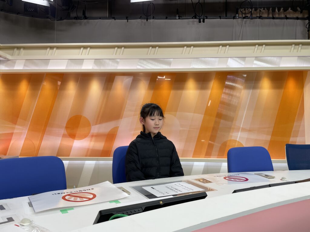 スタジオ見学では,グリーンバックでの合成映像,リモコンで動くカメラ,プロンプターなども体験して,放送に関わる仕事の工夫など,たくさん知ることができました。