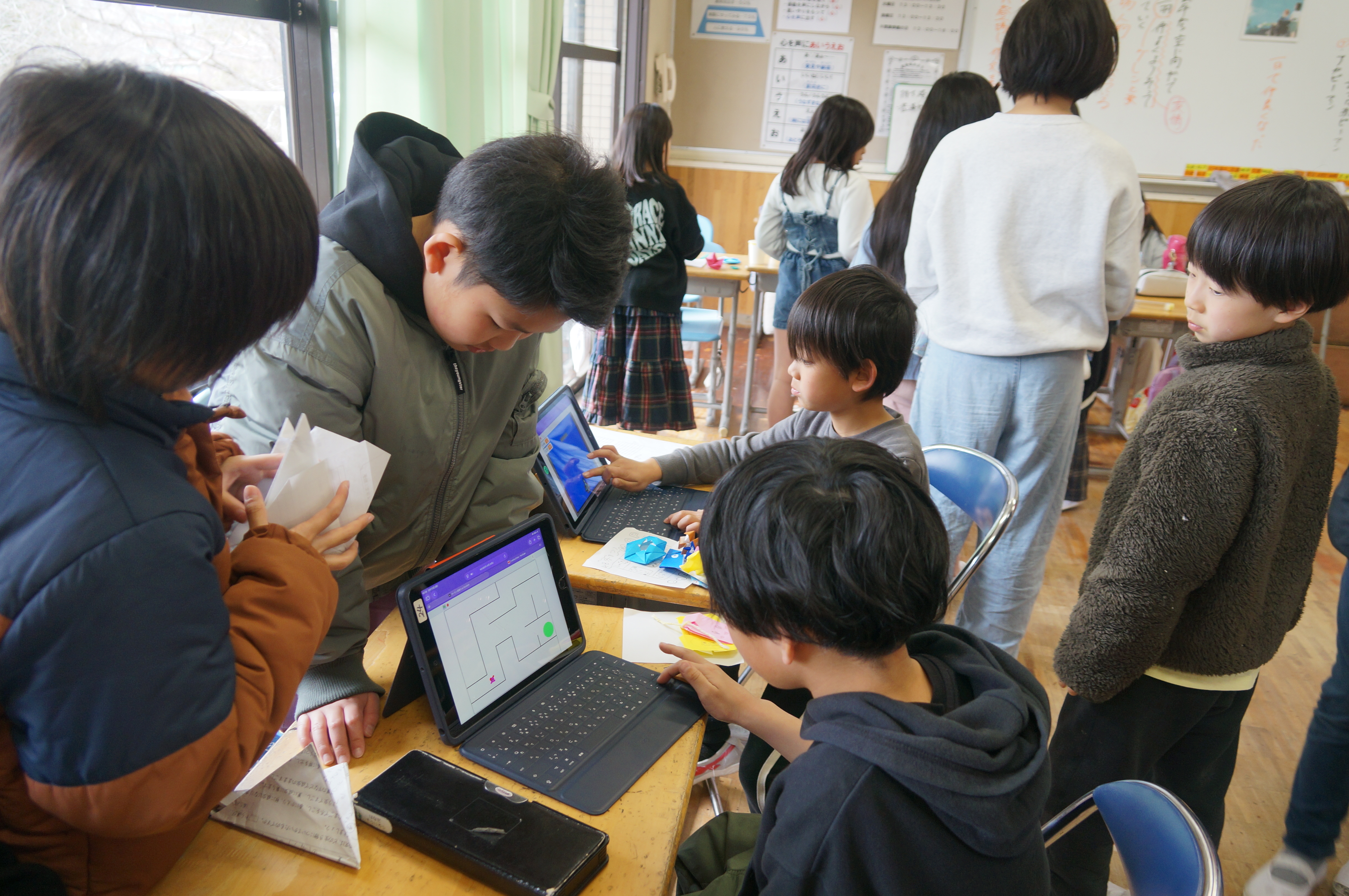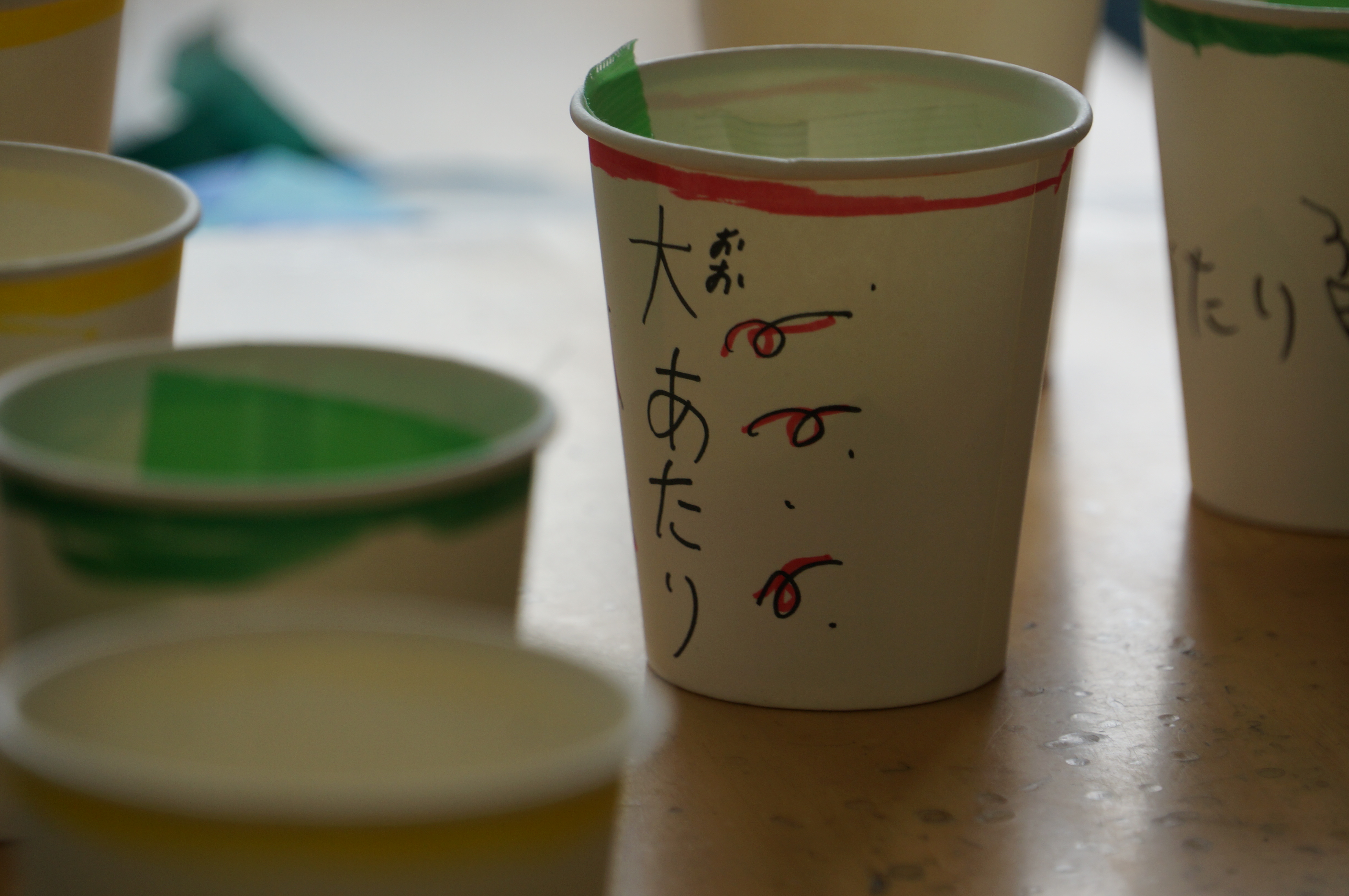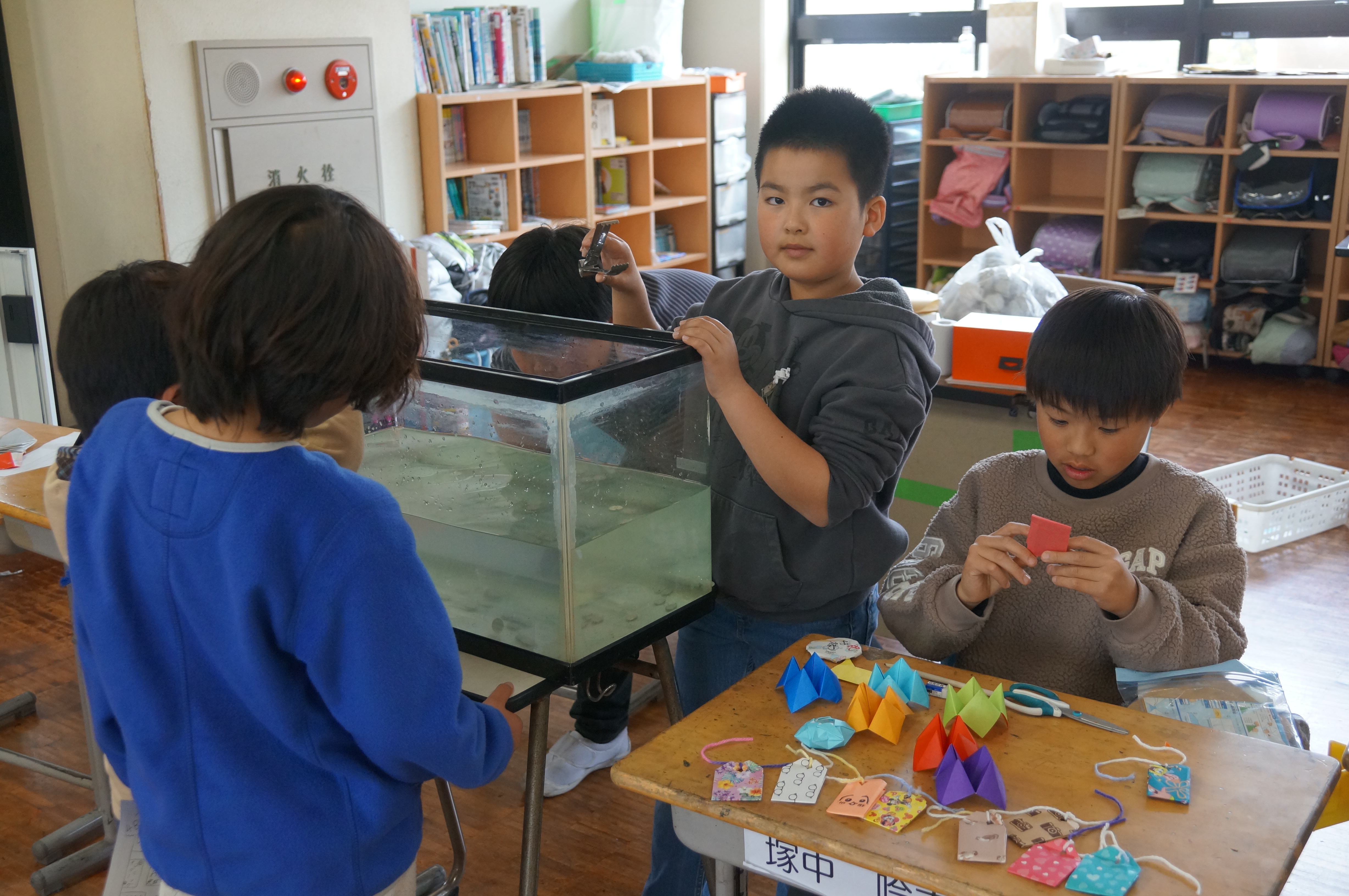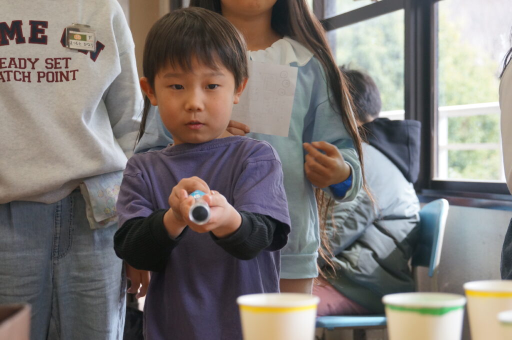 4Bのみんなにまねかれて,いろんな遊びを体験してきました。空気鉄砲を構える真剣な表情がいいですね。