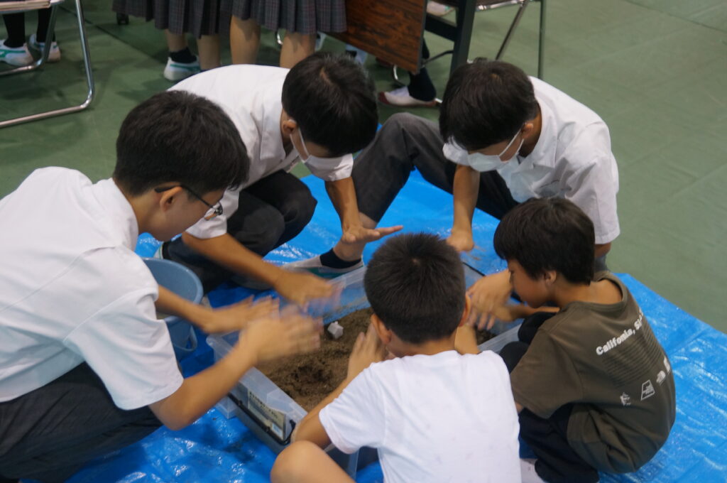 こちらは,砂遊びをしているのではなく,液状化減少のモデル実験を一緒にしているところ。地震を模して入れ物の縁をトントンと叩くと,湿った土の表面に水が浮かび上がりました。