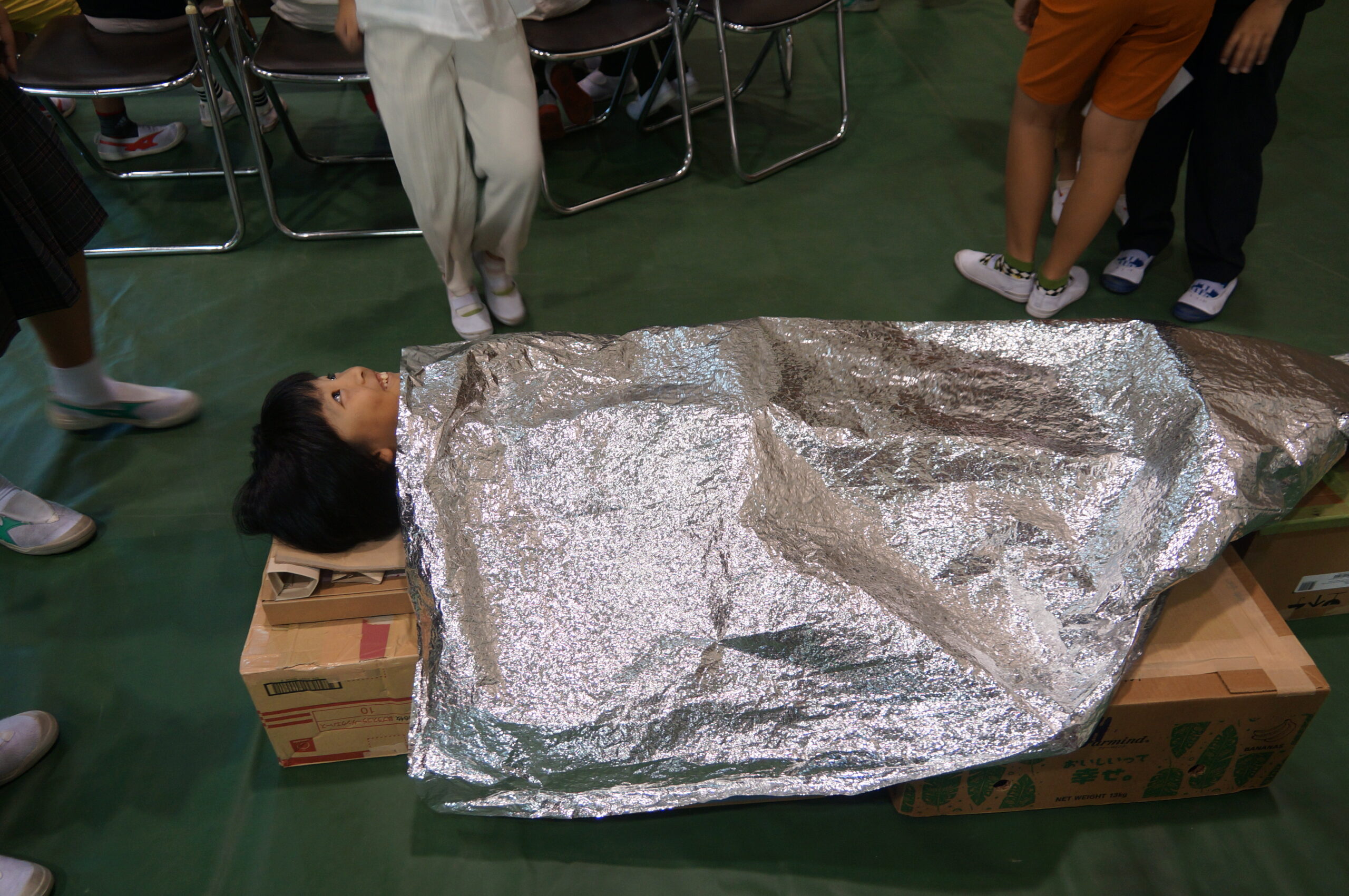 段ボールベットの体験コーナーでは,「うん,まあ,寝れるわ。」という感想。まあ,寝るだけならとりあえず。この銀色のが,予想以上にあたたかくて驚いていました。家でアルミホイルにくるまって寝るとか言い出さなければいいのですが…。