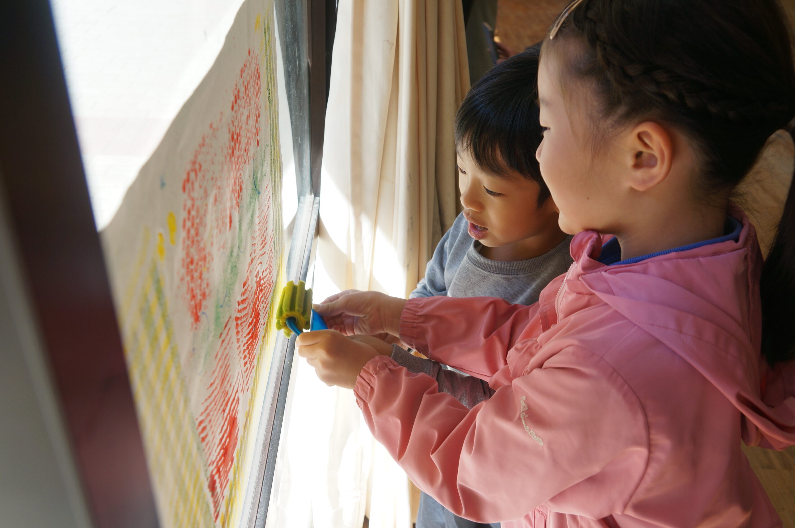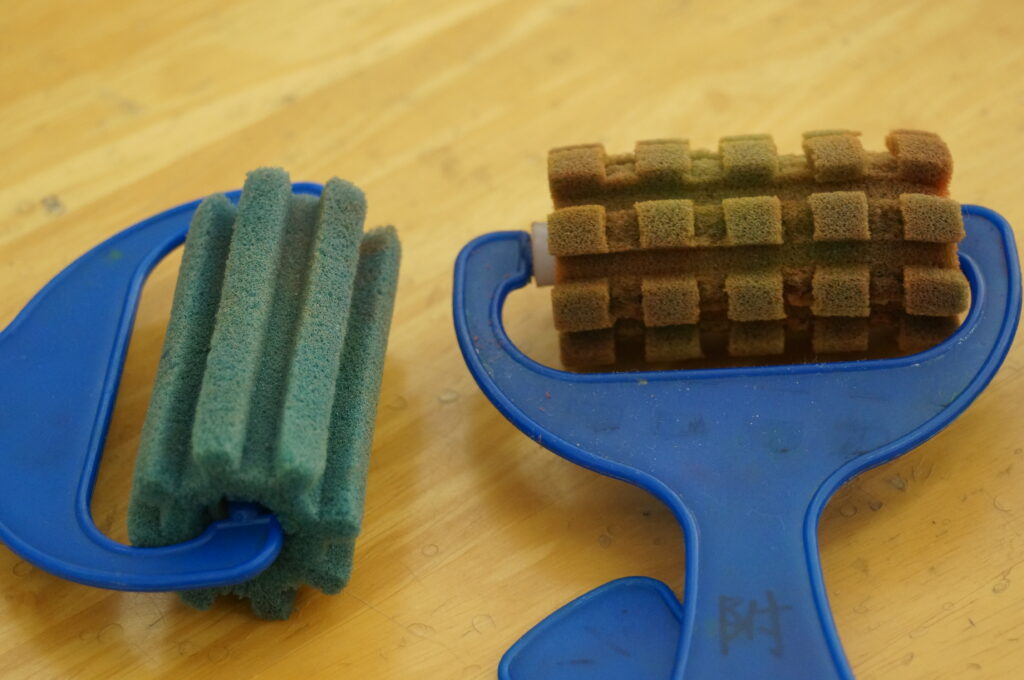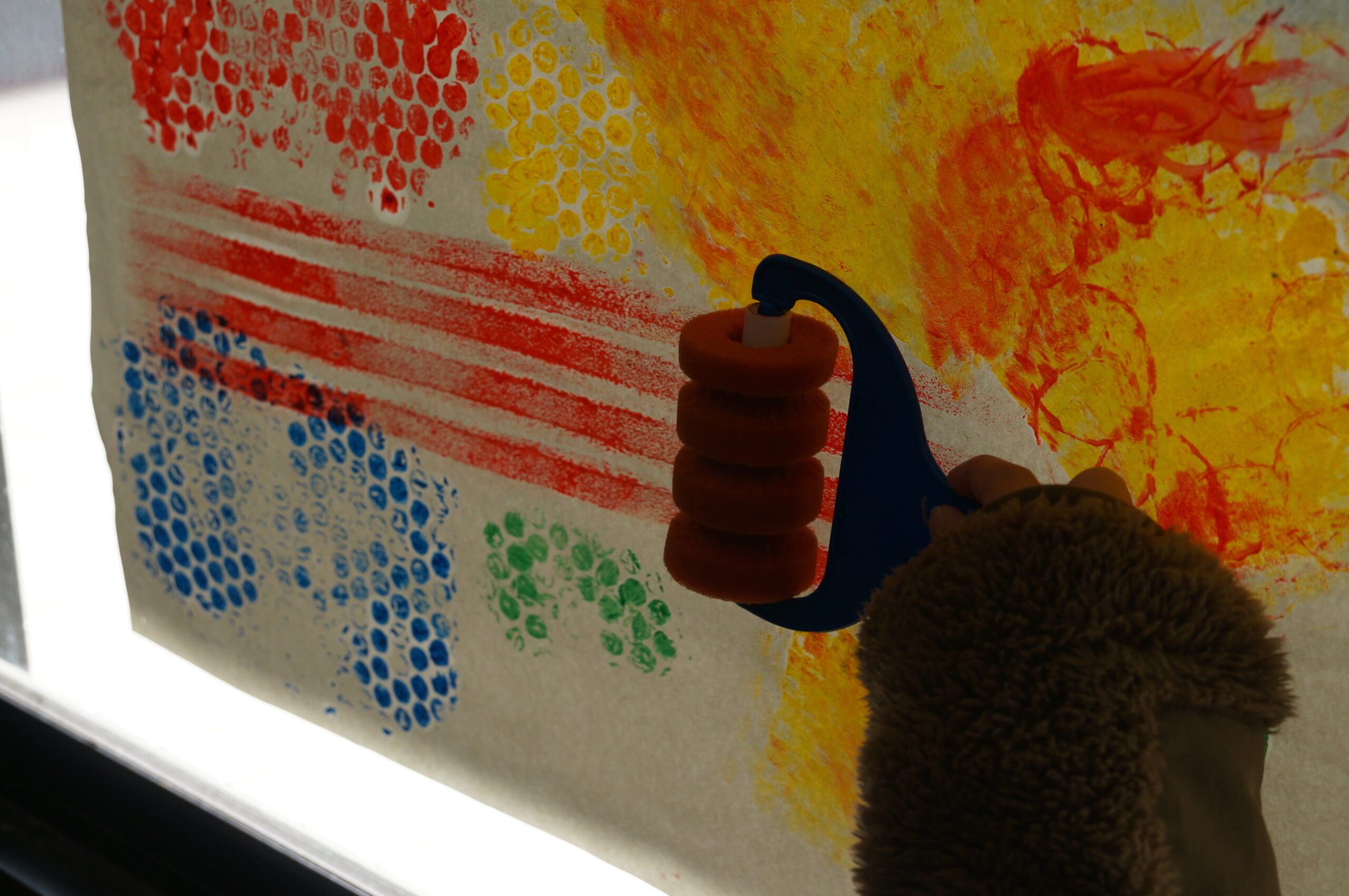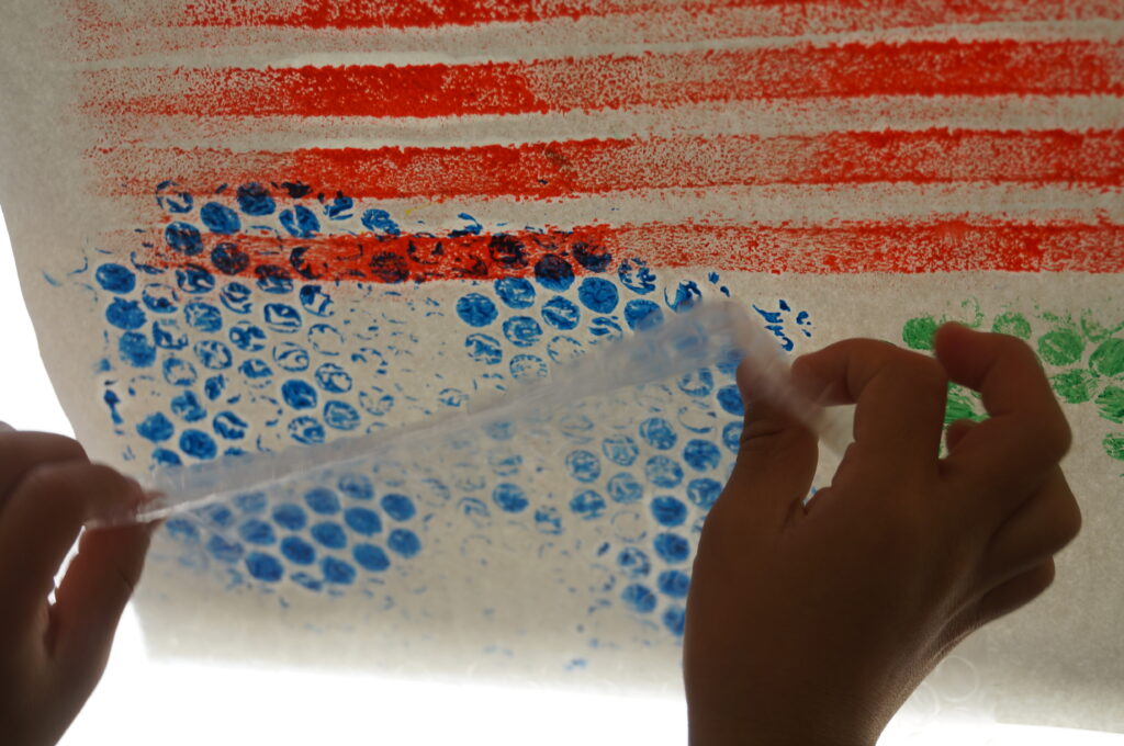 スポンジローラーやプチプチを当てて,なんだか嬉しそうに模様を楽しみます。
