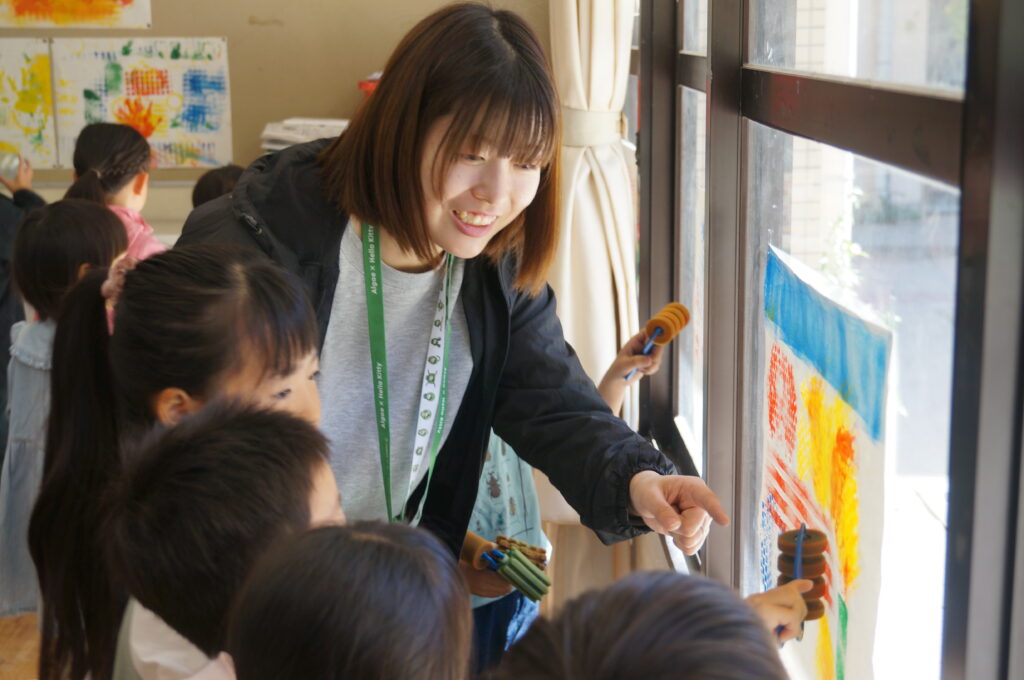 1年生,図画工作科の授業を見に行きました。壁いっぱいに不思議な模様が貼り付けられていて,子どもたちはそれに何かしています。