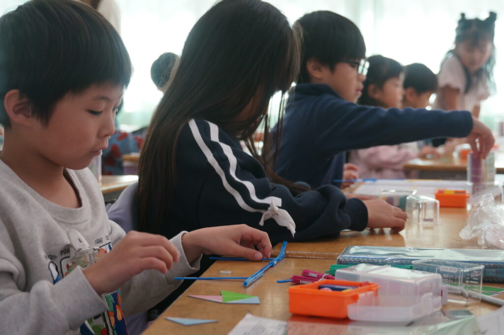 1階に下りていくと,1年生が図形の学習をしていました。自分が作った形が,なにかに見えたようで,「◯◯できた!」と周囲にいる仲間に紹介していました。